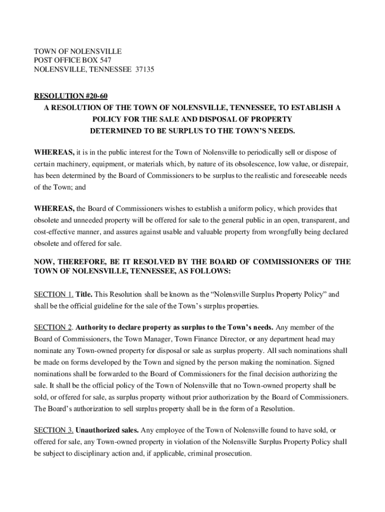 TOWN OF NOBLESVILLE POST OFFICE BOX 547 NOBLESVILLE, TENNESSEE 37135RESOLUTION #2060 A RESOLUTION OF THE TOWN OF NOBLESVILLE, TENNESSEE, TO ESTABLISH A POLICY FOR THE SALE AND DISPOSAL OF PROPERTY