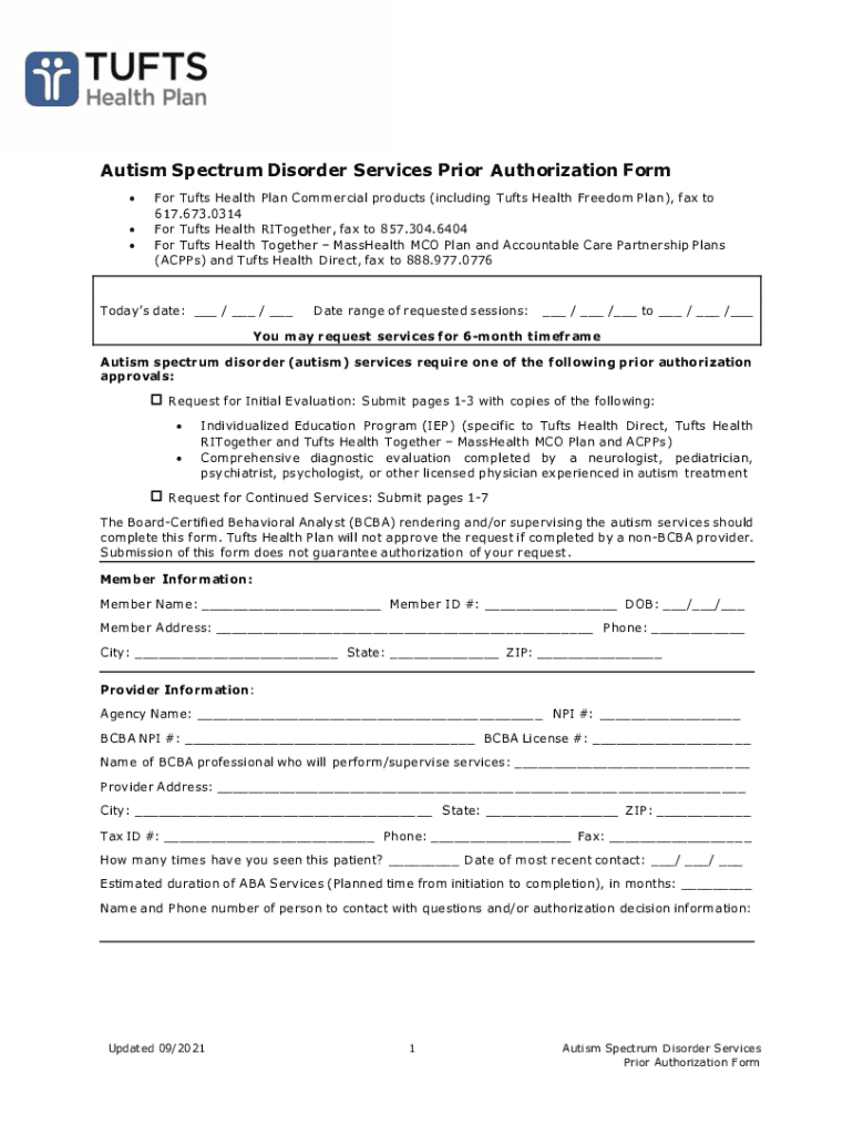 Autism Spectrum Disorder Services Prior Authorization Form For Tufts Health Plan Commercial products (including Tufts Health Freedom Plan), fax to 617.673.0314 For Tufts Health Together, fax to 857.304.6404