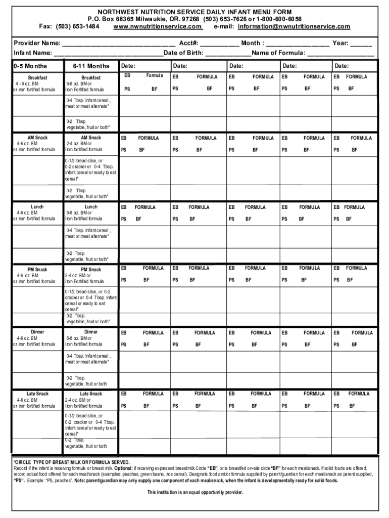 Breakfast 4 6 oz. BM or iron fortified formulaEBFORMULAEBFORMULAEBPSBFPSBFPSBreakfast 68 oz. BM or Iron Fortified formulaEBFormulaEBPSBFPSFORMULA FORMULA BF04 Tbsp. Infant cereal, meat or meat alternate*