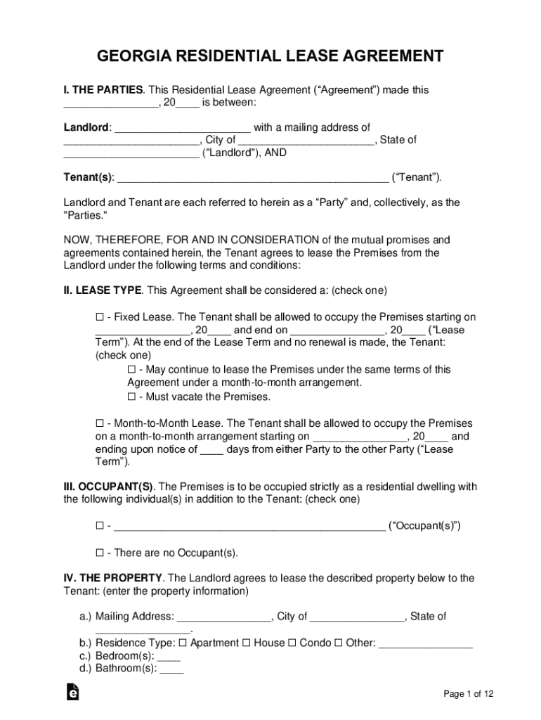 GEORGIA RESIDENTIAL LEASE AGREEMENT I. THE PARTIES. This Residential Lease Agreement (Agreement) made this, 20 is between: Landlord: with a mailing address of, City of, State of (“Landlord “),