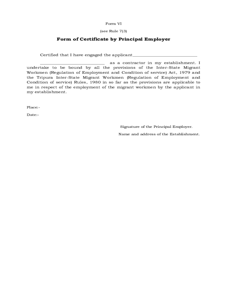 Form VI (see Rule 7(3)Form of Certificate by Principal EmployerCertified that I have engaged the applicant as a contractor in my establishment. I undertake to be bound by all the provisions of the