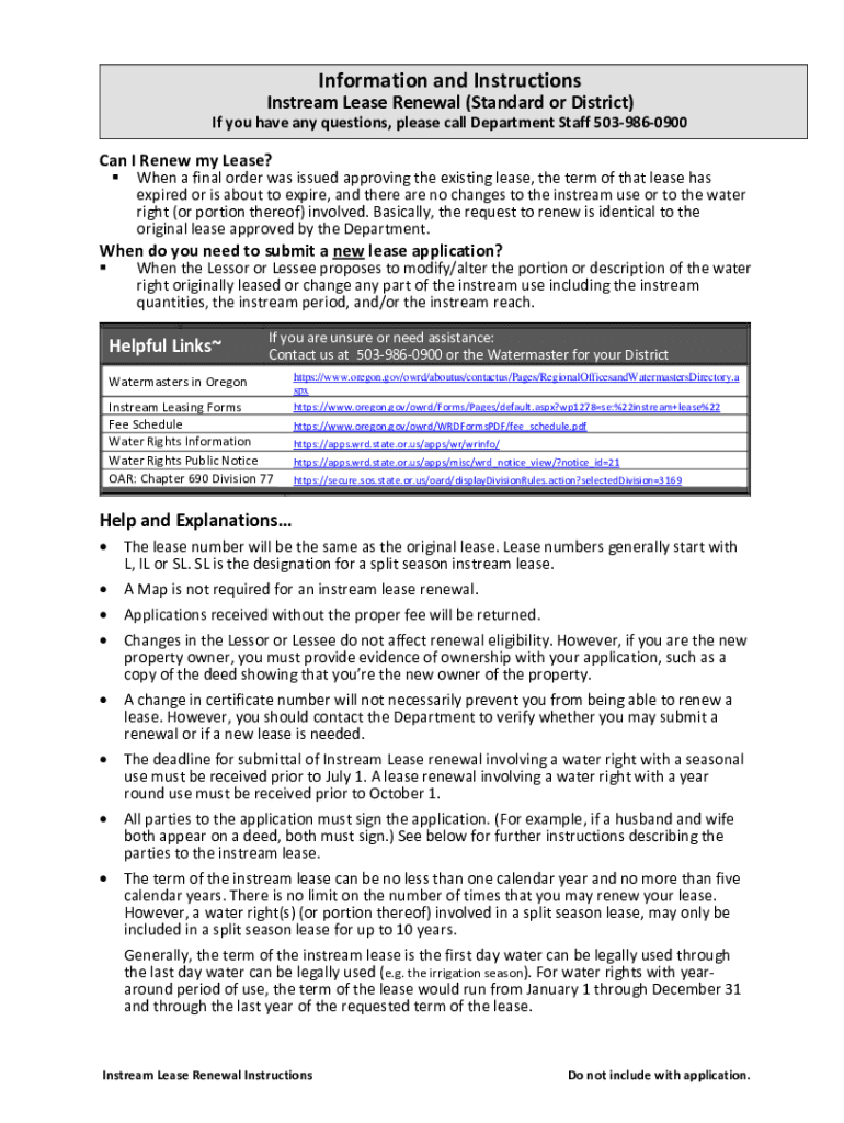 Information and InstructionsInstream Lease Renewal (Standard or District)If you have any questions, please call Department Staff 5039860900Can I Renew my Lease? When a final order was issued approving