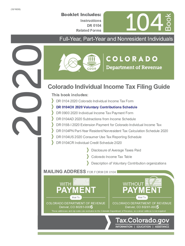 (12/10/20)104BookBooklet Includes:2020Instructions DR 0104 Related FormsFullYear, Part Year and Nonresident Individuals Colorado Individual Income Tax Filing Guide This book includes: DR 0104 2020