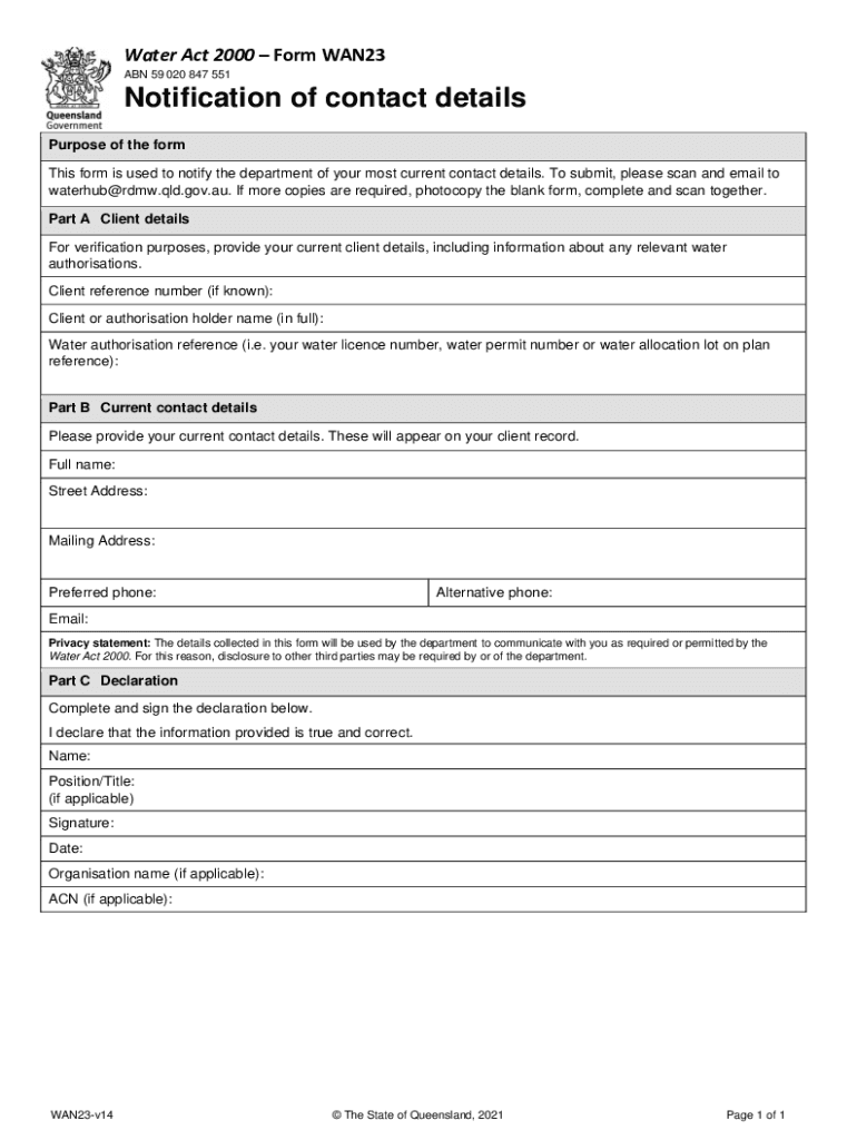 Water Act 2000 Form WAN23 ABN 59 020 847 551Notification of contact details Purpose of the form This form is used to notify the department of your most current contact details. To submit, please scan