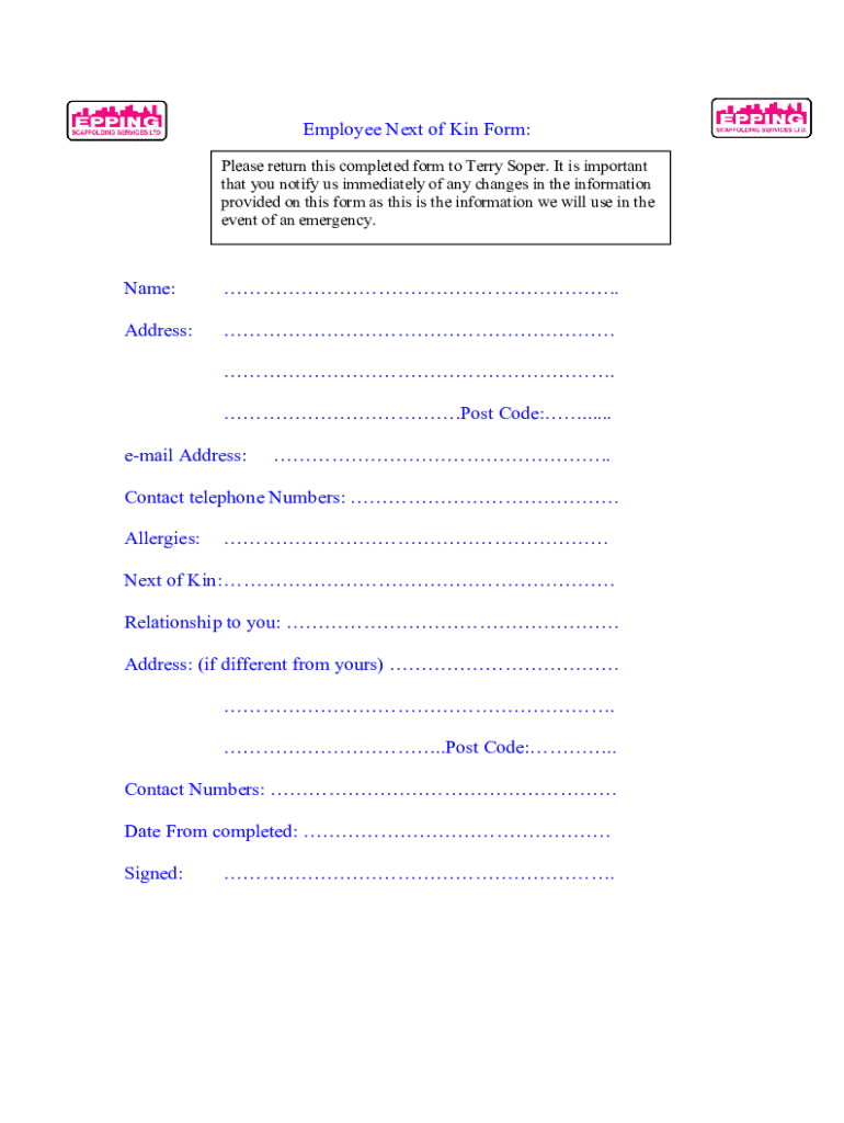 Employee Next of Kin Form: Please return this completed form to Terry Super. It is important that you notify us immediately of any changes in the information provided on this form as this is the information