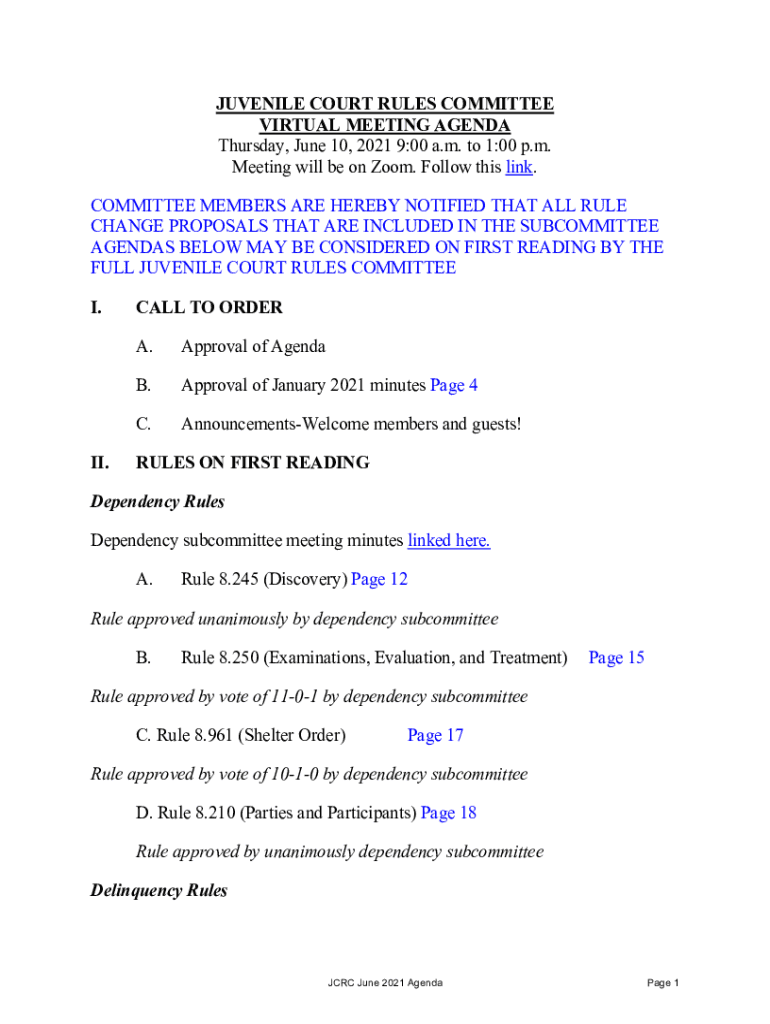 JUVENILE COURT RULES COMMITTEE VIRTUAL MEETING AGENDA Thursday, June 10, 2021 9:00 a.m. to 1:00 p.m. Meeting will be on Zoom. Follow this link. COMMITTEE MEMBERS ARE HEREBY NOTIFIED THAT ALL RULE