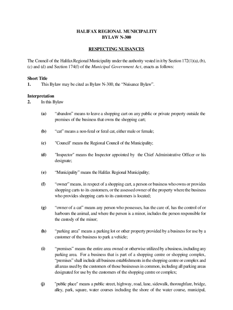 HALIFAX REGIONAL MUNICIPALITY BYLAW N300 RESPECTING NUISANCES The Council of the Halifax Regional Municipality under the authority vested in it by Section 172(1)(a), (b), (c) and (d) and Section 174(f)