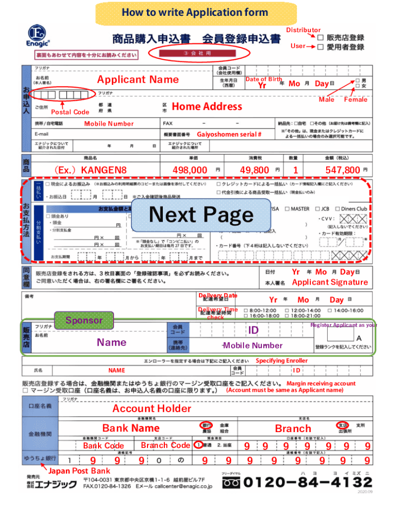 How to write Application form DistributorUserApplicant Name Date of BirthYrMoDayHome AddressPostal CodeMaleFemaleMobile Number Gaiyoshomen serial #Ex.KANGEN8498,00049,8001547,800Next Page Yr Mo Day