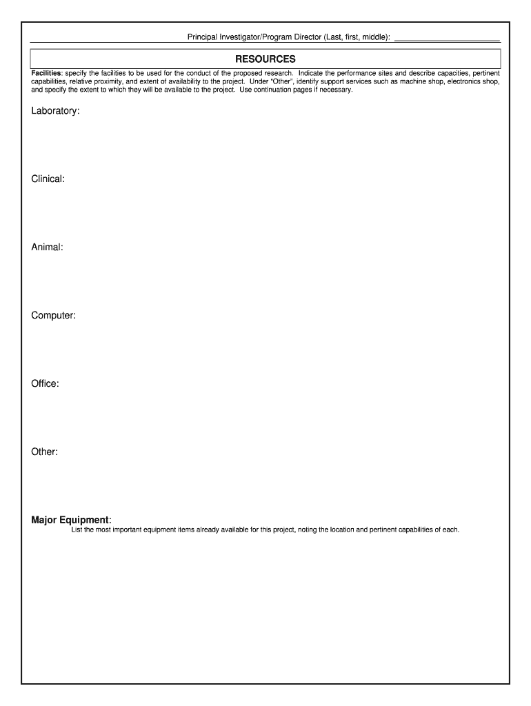 Principal Investigator/Program Director (Last, first, middle): RESOURCES Facilities: specify the facilities to be used for the conduct of the proposed research. Indicate the performance sites and