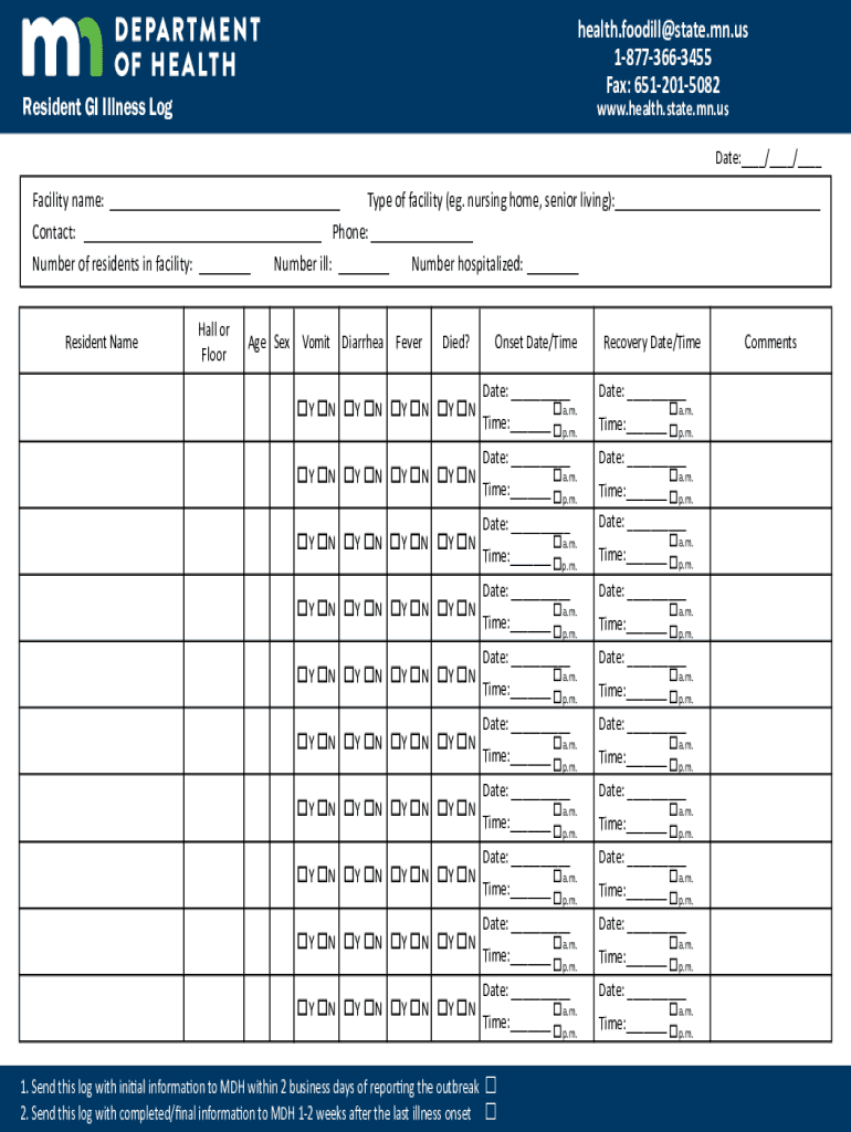 Health.foo dill state.MN.us 18773663455 Fax: 6512015082Resident GI Illness Low.health.state.MN.update: / / Facility name: Type of facility (e.g. nursing home, senior living): Contact: Phone: Number