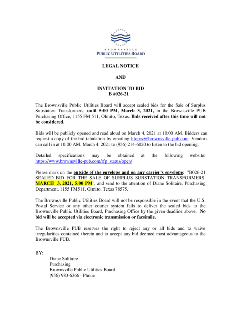 LEGAL NOTICE AND INVITATION TO BID B #02621 The Brownsville Public Utilities Board will accept sealed bids for the Sale of Surplus Substation Transformers, until 5:00 PM, March 3, 2021, in the Brownsville