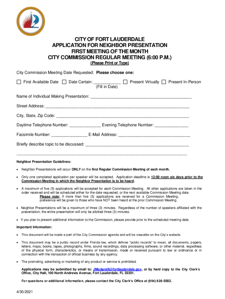 CITY OF FORT LAUDERDALE APPLICATION FOR NEIGHBOR PRESENTATION FIRST MEETING OF THE MONTH CITY COMMISSION REGULAR MEETING (6:00 P.M.) (Please Print or Type) City Commission Meeting Date Requested: