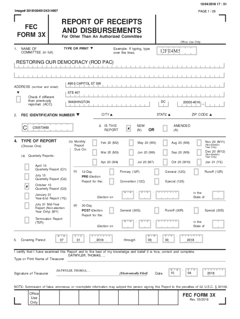 10/04/2018 17 : 51 Image# 201810049124314907PAGE 1 / 28REPORT OF RECEIPTS AND DISBURSEMENTS FEC FORM 3XFor Other Than An Authorized Committee Office Use Only1.NAME OF COMMITTEE (in full)Example:If