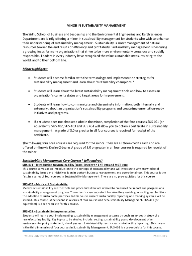 MINORINSUSTAINABITYMANAGEMENT TheSidhuSchoolofBusinessandLeadershipandtheEnvironmentalEngineeringandEarthSciences Departmentarejointlyofferingaminorinsustainabilitymanagementforstudentswhowishtoenhance