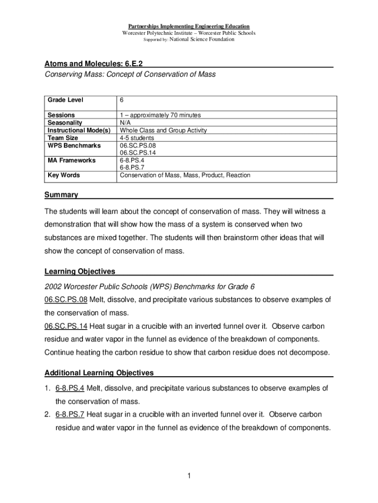 Partnerships Implementing Engineering Education Worcester Polytechnic Institute Worcester Public Schools Supported by: National Science FoundationAtoms and Molecules: 6. E.2 Conserving Mass: Concept