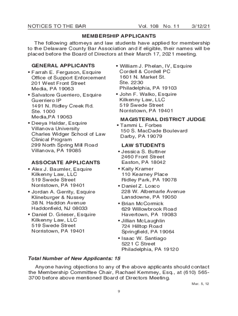 NOTICES TO THE Barrel. 108No. 113/12/21MEMBERSHIP APPLICANTS The following attorneys and law students have applied for membership to the Delaware County Bar Association and if eligible, their names