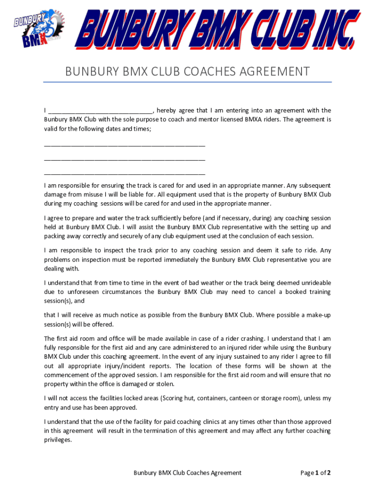 Get the free Bunbury BMX Club Coaches Agreement