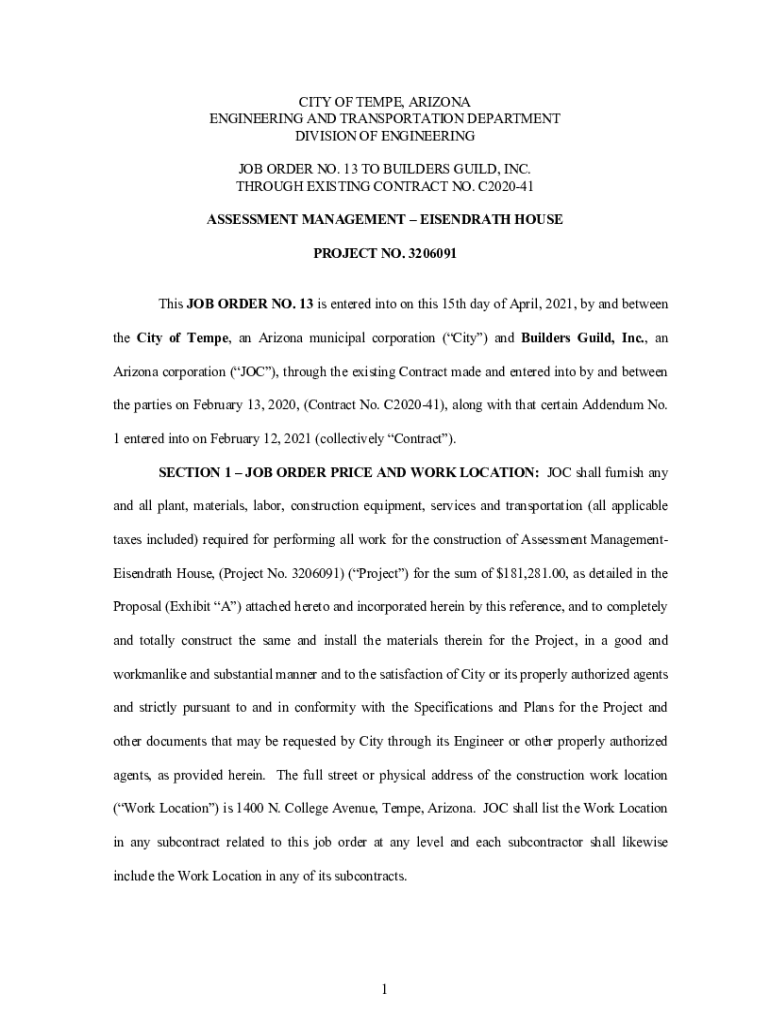 CITY OF TEMPE, ARIZONA ENGINEERING AND TRANSPORTATION DEPARTMENT DIVISION OF ENGINEERING JOB ORDER NO. 13 TO BUILDERS GUILD, INC. THROUGH EXISTING CONTRACT NO. C202041 ASSESSMENT MANAGEMENT EISENDRATH