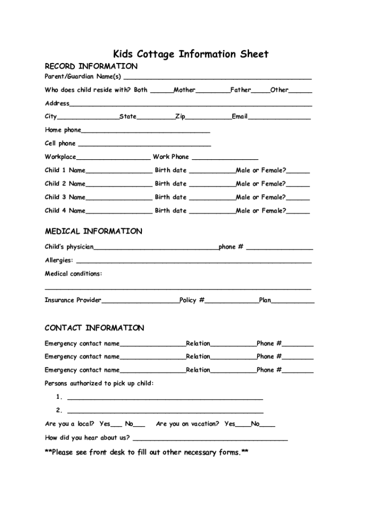 Kids Cottage Information Sheet RECORD INFORMATION Parent/Guardian Name(s) Who does child reside with? Both Mother Father Other Address City State Zip Email Home phone Cell phone Workplace Work Phone