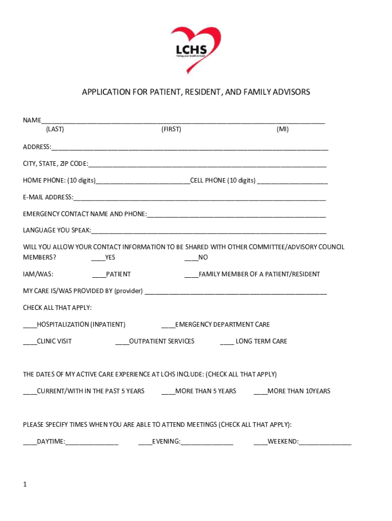 APPLICATION FOR PATIENT, RESIDENT, AND FAMILY ADVISORS NAME (LAST) (FIRST) (MI) ADDRESS: CITY, STATE, ZIP CODE: HOME PHONE: (10 digits) CELL PHONE (10 digits) EMAIL ADDRESS: EMERGENCY CONTACT NAME