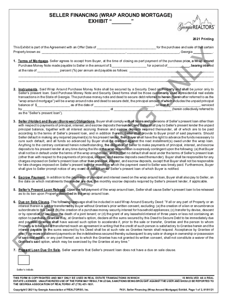 SELLER FINANCING (WRAP AROUND MORTGAGE) EXHIBIT 2021 Printing This Exhibit is part of the Agreement with an Offer Date of for the purchase and sale of that that certain Property known as:, ,, Georgia.