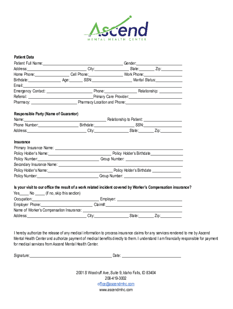 Patient Data Patient Full Name: Gender: Address: City: State: Zip: Home Phone: Cell Phone: Work Phone: Birthdate: Age: SSN: Marital Status: Email: Emergency Contact: Phone: Relationship: Referral: