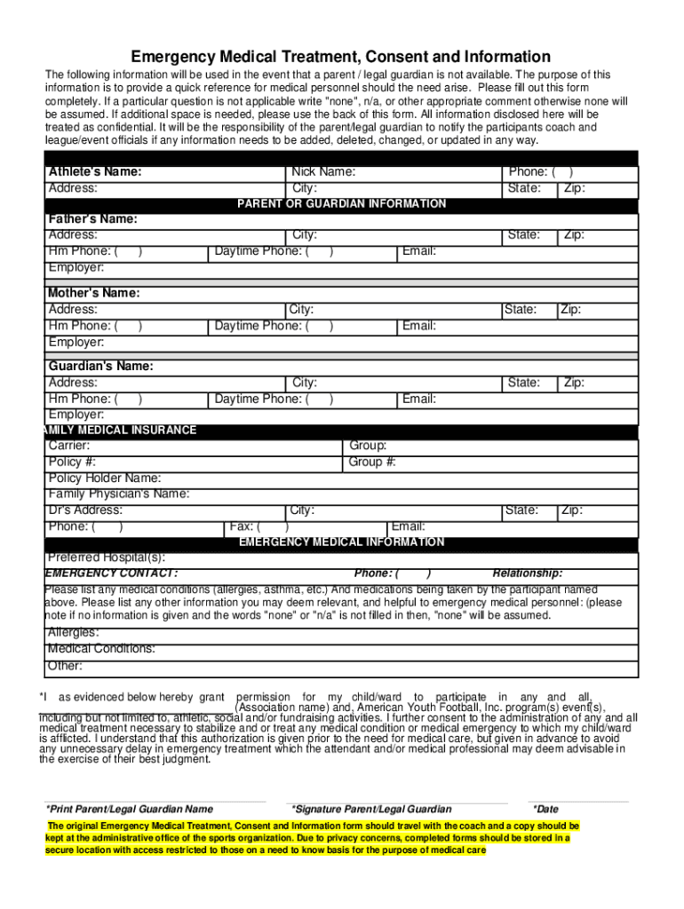 Emergency Medical Treatment, Consent and Information The following information will be used in the event that a parent / legal guardian is not available. The purpose of this information is to provide
