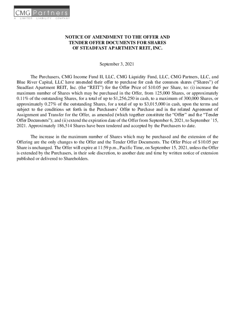 NOTICE OF AMENDMENT TO THE OFFER AND TENDER OFFER DOCUMENTS FOR SHARES OF STEADFAST APARTMENT REIT, INC. September 3, 2021, The Purchasers, CMG Income Fund II, LLC, CMG Liquidity Fund, LLC, CMG Partners,