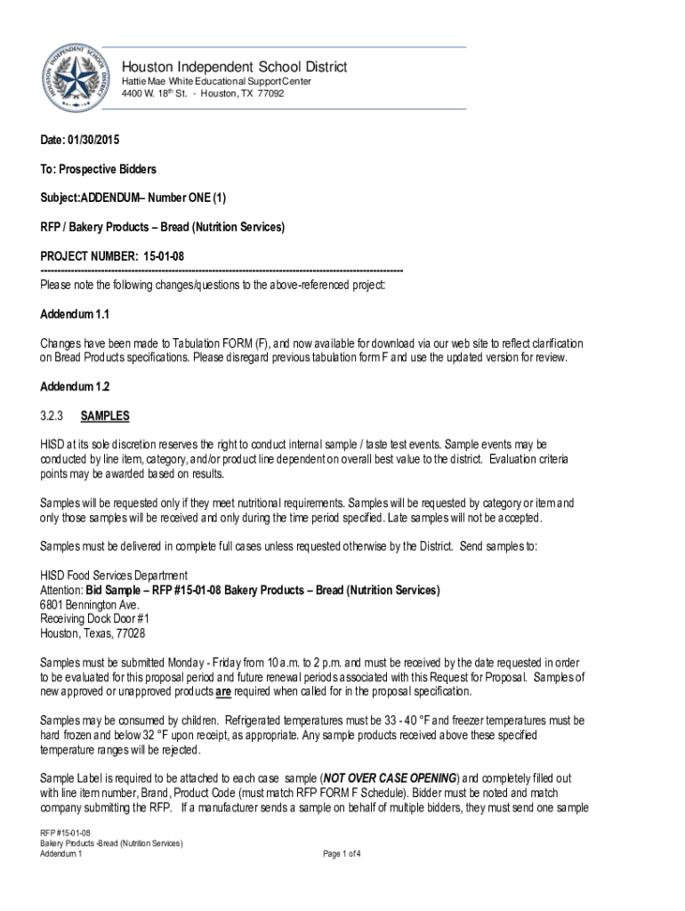Houston Independent School District Hattie Mae White Educational Support Center 4400 W. 18th St. Houston, TX 77092Date: 01/30/2015 To: Prospective Bidders Subject: ADDENDUM Number ONE (1) RFP / Bakery