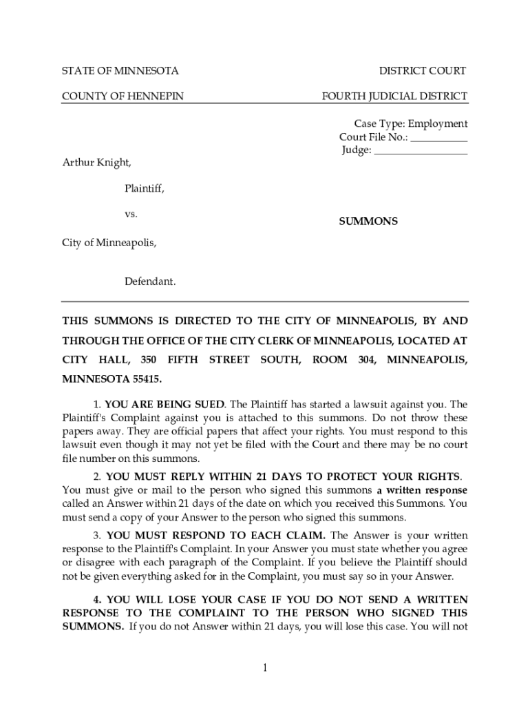 STATE OF MINNESOTADISTRICT COURTEOUSLY OF HENNEPINFOURTH JUDICIAL DISTRICT Case Type: Employment Court File No.: Judge: Arthur Knight, Plaintiff, vs. Summonsing of Minneapolis, Defendant. THIS SUMMONS