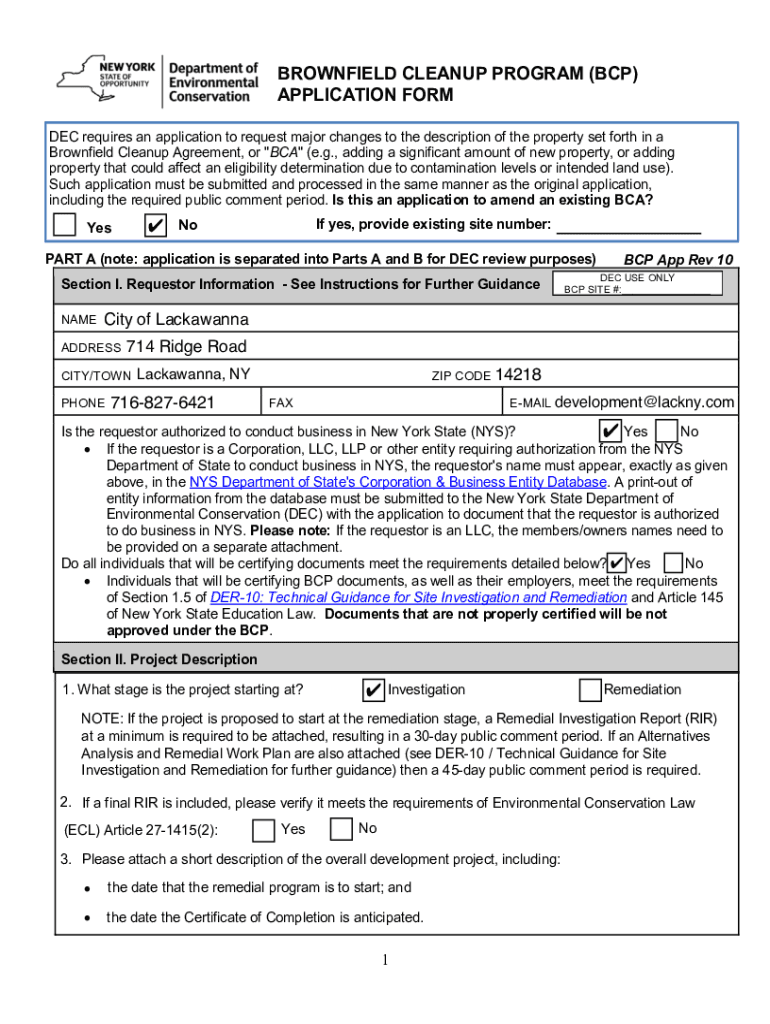 BROWNFIELD CLEANUP PROGRAM (BCP) APPLICATION FORM DEC requires an application to request major changes to the description of the property set forth in a Brownfield Cleanup Agreement, or BCA (e.g.,