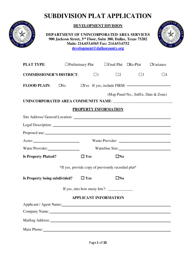 TX Subdivision Plat Application - Dallas County 2020-2026 free printable template