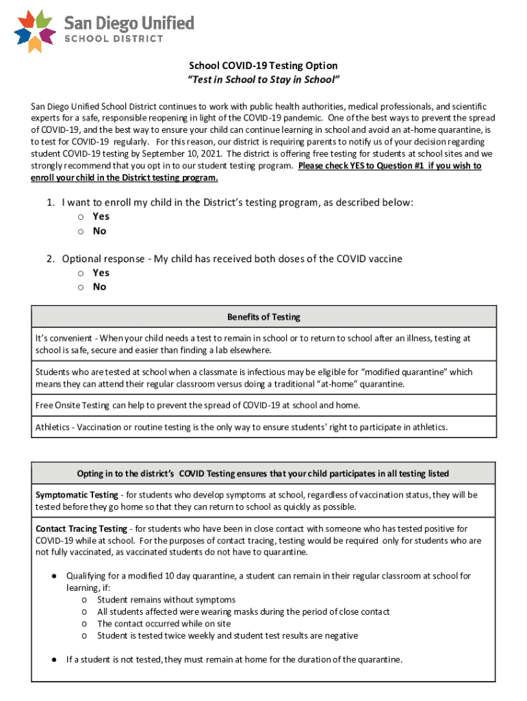 School COVID-19 Testing Option Test in School to Stay in School San Diego Unified School District continues to work with public health authorities, medical professionals, and scientific experts for