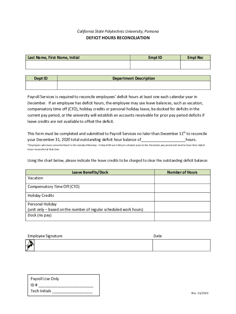 California State Polytechnic University, PomonaDEFICIT HOURS Reconciliations Name, First Name, Initialed Idem pl Department DescriptionPayroll Services is required to reconcile employees deficit hours