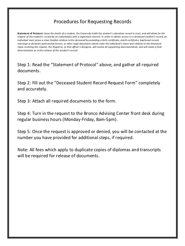 Procedures for Requesting Records Statement of Protocol: Upon the death of a student, the University holds the students' education record in trust, and will allow for the request of the students record