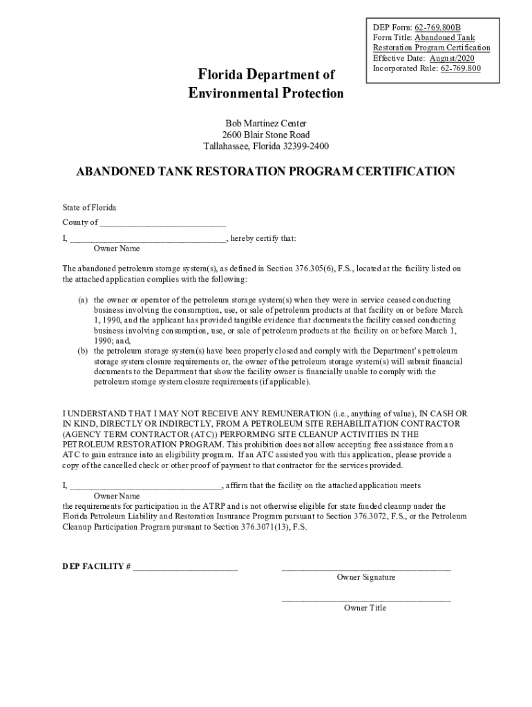Florida Department of Environmental Protection DEP Form: 62769.800B Form Title: Abandoned Tank Restoration Program Certification Effective Date: August/2020 Incorporated Rule: 62769.800Bob Martinez