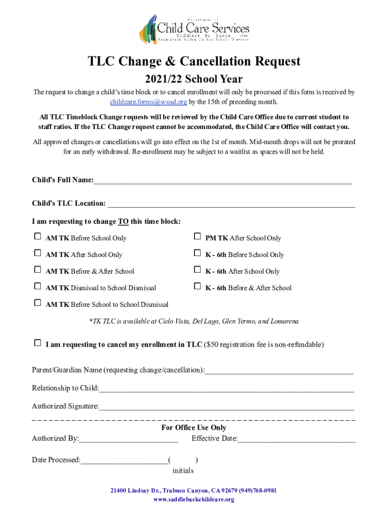 TLC Change & Cancellation Request 2021/22 School Year The request to change a children time block or to cancel enrollment will only be processed if this form is received by childcare. Forms sound.org