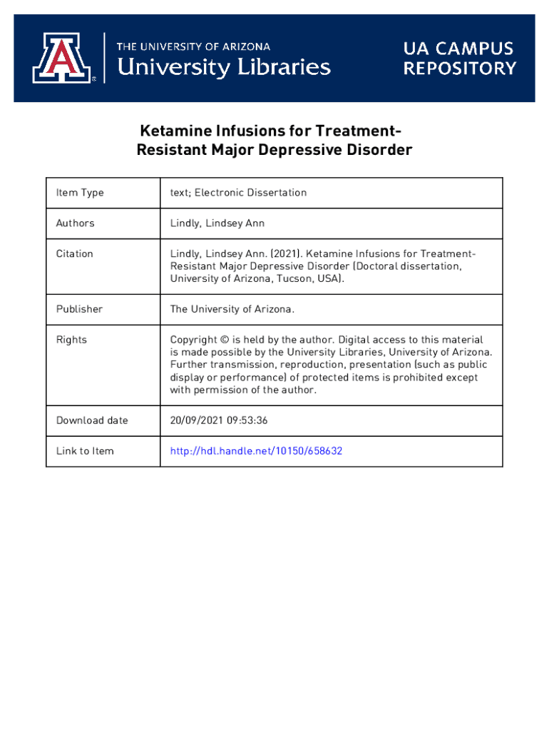 Infusions for TreatmentResistant Major Depressive Disorder Item Type text; Electronic DissertationAuthorsLindly, Lindsey AnnCitationLindly, Lindsey Ann. (2021). Infusions for TreatmentResistant Major