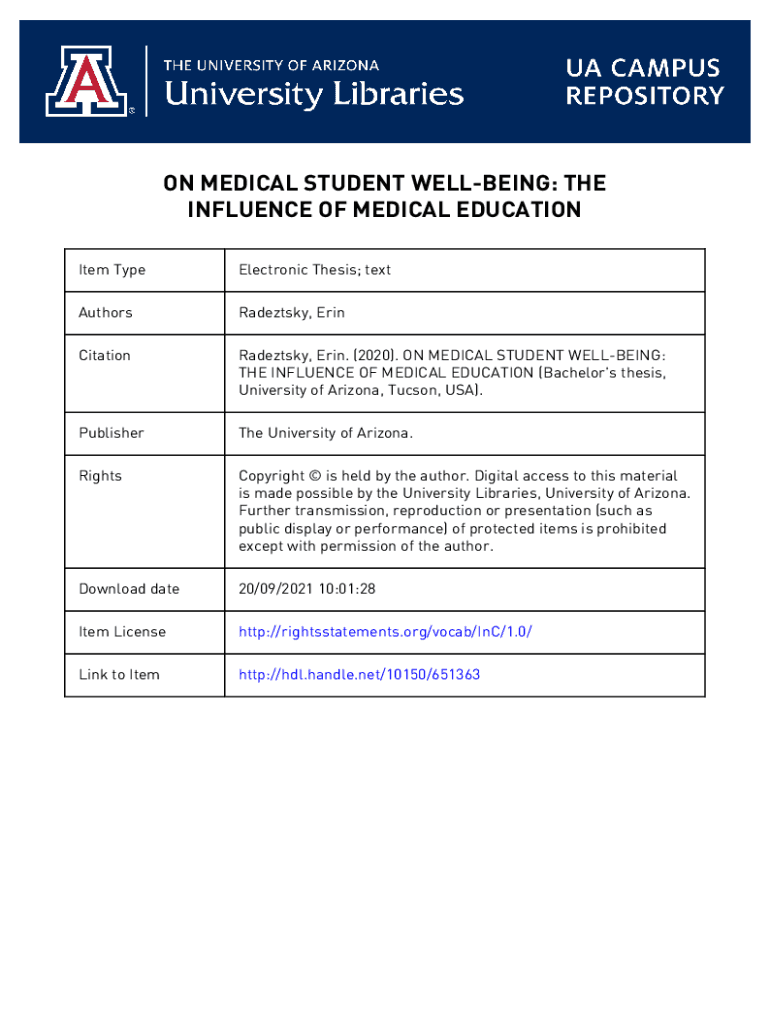 ON MEDICAL STUDENT WELLBEING: THE INFLUENCE OF MEDICAL EDUCATION Item TypeElectronic Thesis; textAuthorsRadeztsky, ErinCitationRadeztsky, Erin. (2020). ON MEDICAL STUDENT WELLBEING: THE INFLUENCE