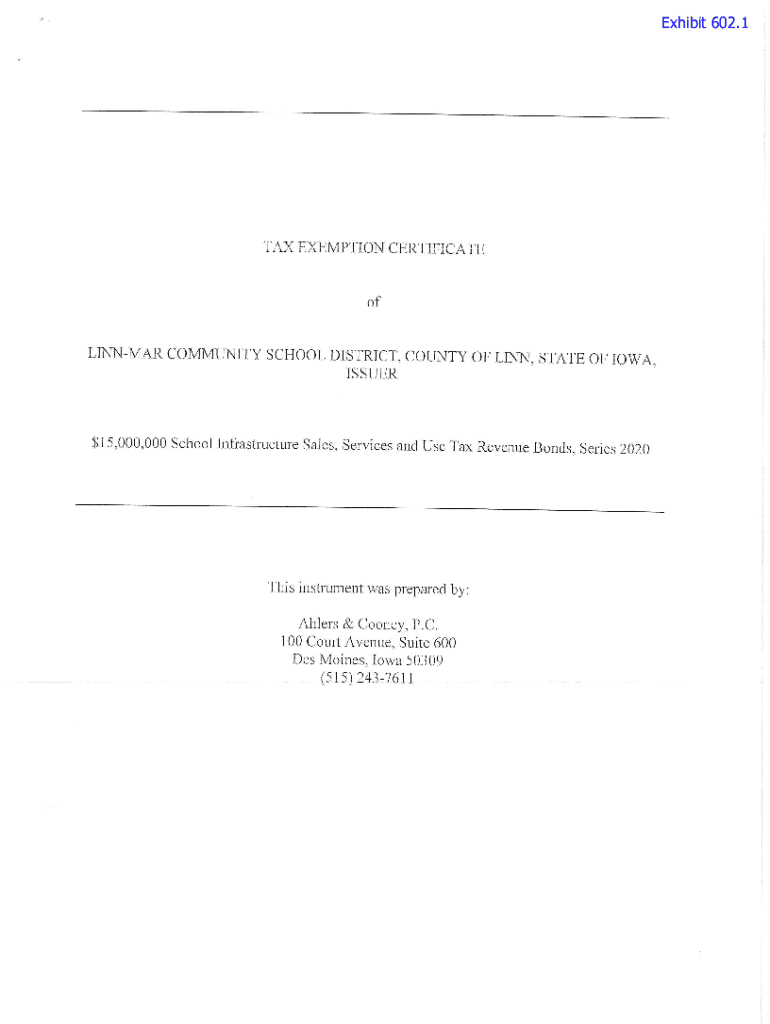 Exhibit 602.1LINNMAR COMMUNITY SCHOOL DISTRICT, COUNTY OF LINE, STATE OF IOWA, ISSUER$15,000,000 School Infrastructure Sales, Services and Use Tax Revenue Bonds, Series 2020This instrument was prepared