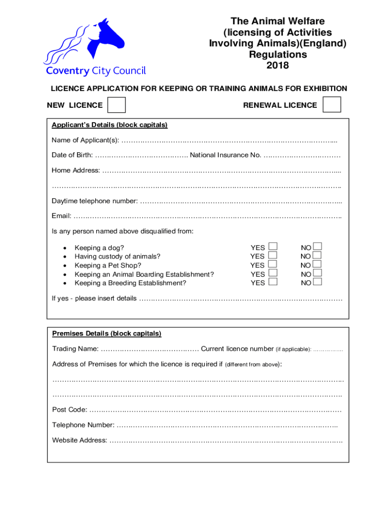 The Animal Welfare (licensing of Activities Involving Animals)(England) Regulations 2018LICENCE APPLICATION FOR KEEPING OR TRAINING ANIMALS FOR EXHIBITION NEW LICENCERENEWAL LICENCEApplicants Details