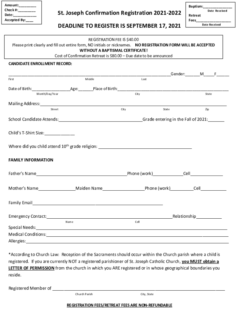 Amount: Check #: Date: Accepted By: Baptism: St. Joseph Confirmation Registration 20212022Date ReceivedRetreat Fees DEADLINE TO REGISTER IS SEPTEMBER 17, 2021Date ReceivedREGISTRATION FEE IS $40.00