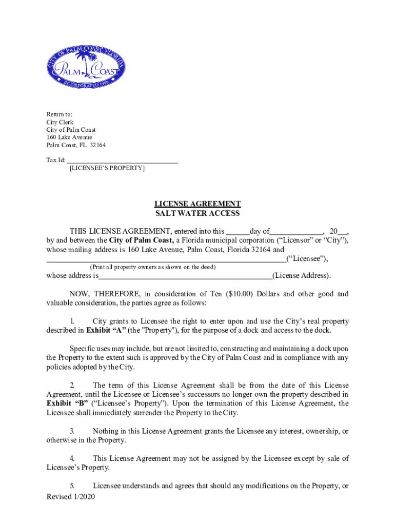 FL License Agreement Salt Water Access - City of Palm Coast 2020-2026 free printable template