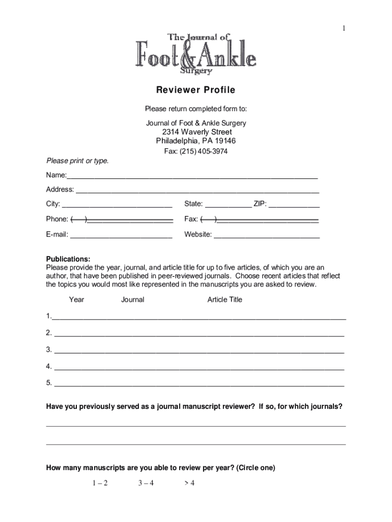 1Reviewer Profile Please return completed form to: Journal of Foot & Ankle Surgery2314 Waverley Street Philadelphia, PA 19146 Fax: (215) 4053974Please print or type. Name: Address: City: State: ZIP: