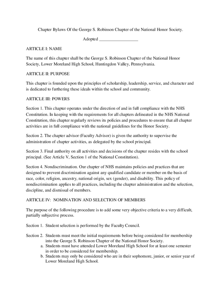 Chapter Bylaws Of the George S. Robinson Chapter of the National Honor Society. Adopted ARTICLE I: NAME The name of this chapter shall be the George S. Robinson Chapter of the National Honor Society,