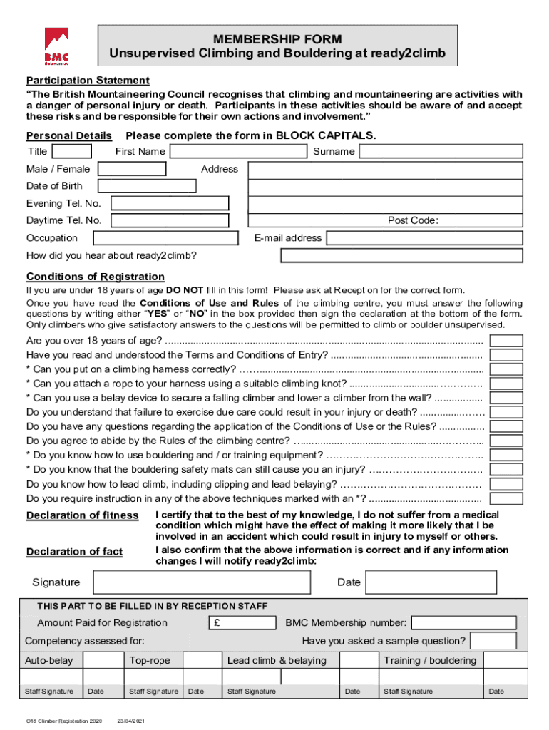 MEMBERSHIP FORM Unsupervised Climbing and Bouldering at ready2climb Participation Statement The British Mountaineering Council recognizes that climbing and mountaineering are activities with a danger