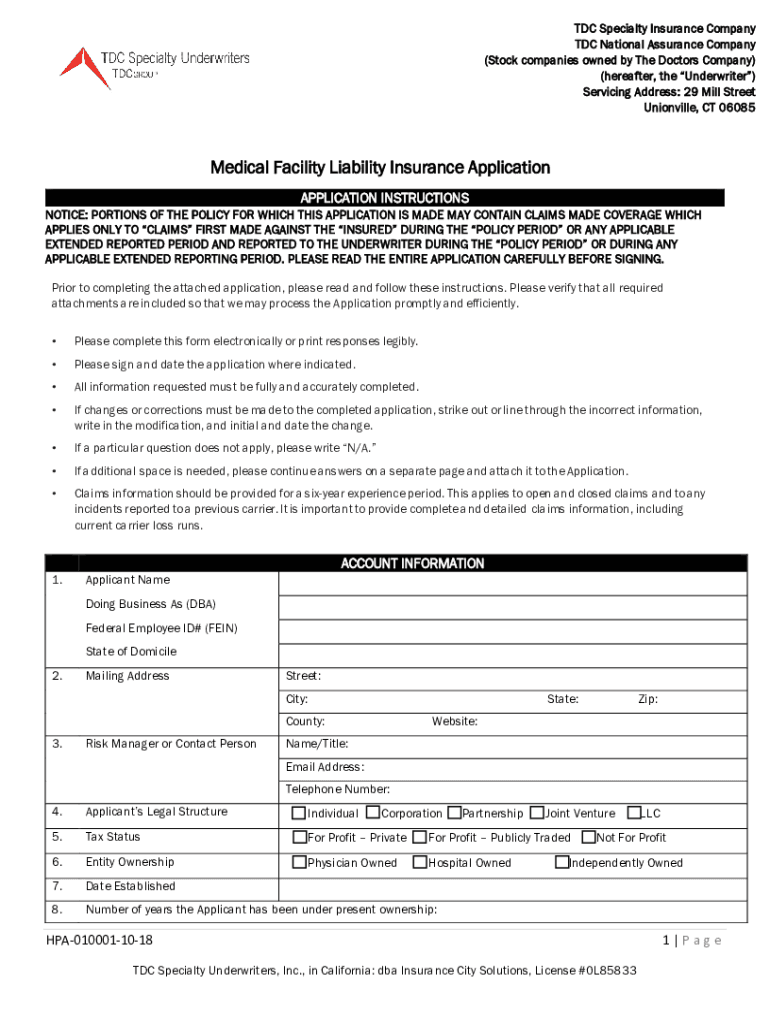 TDC Specialty Insurance Company TDC National Assurance Company (Stock companies owned by The Doctors Company) (hereafter, the Underwriter) Servicing Address: 29 Mill Street Zionville, CT 06085Medical