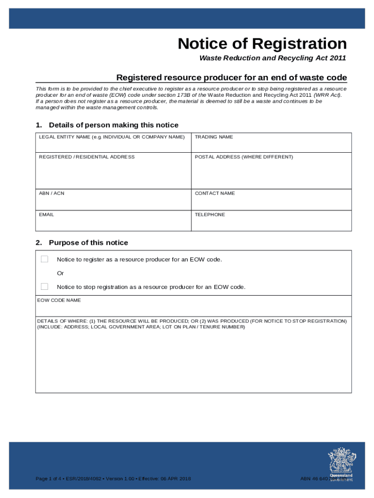 - Get the Registered resource producer for an end of waste code. This is used for an application for a specific approval under Chapter 8 of the Waste Reduction and Recycling 2011 to use a resource for a beneficial use. form in PDFfiller’s catalogue.