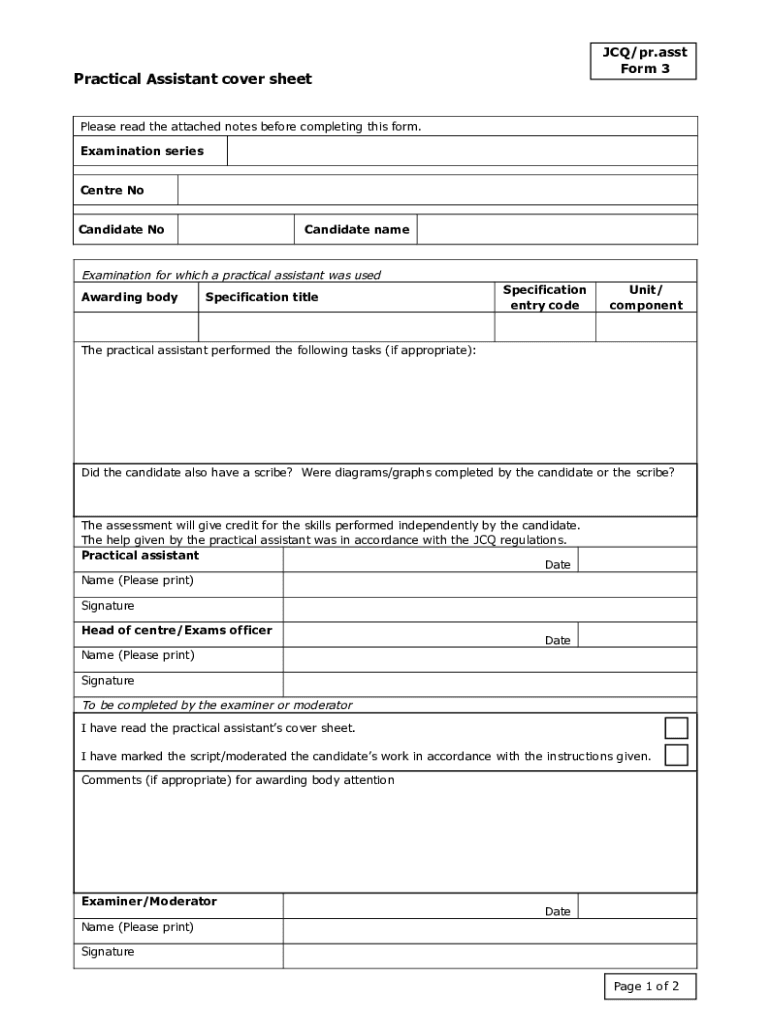 Schools, colleges, and examination centers that have practical assistants assisting with examinations regulated by JCQ are required to file form-3practical-assistant-cover-sheet - jcqprasst.