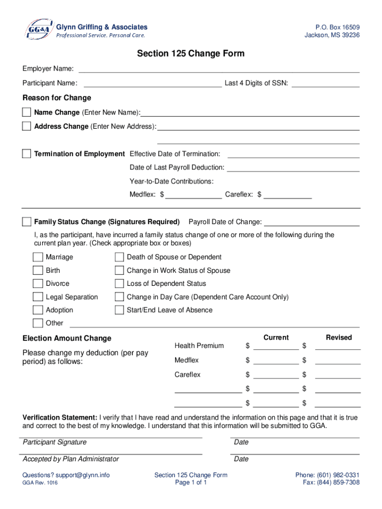 Glynn Griffin & Associates. O. Box 16509 Jackson, MS 39236Professional Service. Personal Care. Section 125 Change Form Employer Name: Participant Name:Last 4 Digits of SSN:Reason for Change Name Change